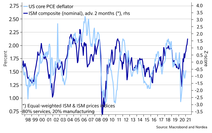 But Nordea finds a relation with core PCE: “The nominal ISM composite suggests a move above 2% for the core PCE deflator, as well as a move to ~3.5% for headline inflation over the next several months.”