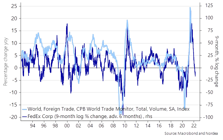 Nordea says that FedEx is on the front line of those companies feeling the heat of a slowing cycle