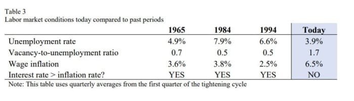 Historically, they note, the likelihood of a soft landing is very low based on current conditions. And the unemployment rate and wage inflation data is much different now than in the soft landings of 1965, 1984 and 1994.