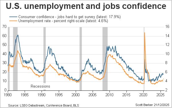 The important stuff from the survey is that the stats suggest that the labor market is tightening. “Jobs hard to get” is falling while “jobs are plentiful” is rising (chart from Scotty Barber)
